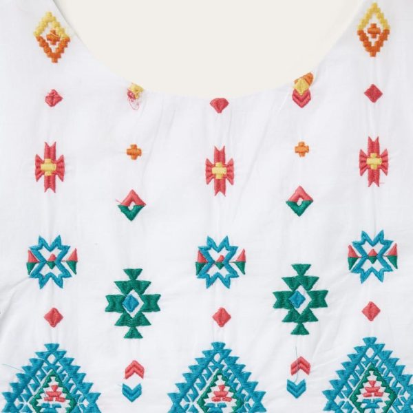 Colorful, lightweight and versatile, this white cotton lawn dress is embroidered with our vibrant red, yellow and turquoise Bright Schiffli design. It has an empire waist and large V back with a button strap closure. Darts at the bust provide a more custom-like fit, while the gathered skirt hits below the knees for a timeless silhouette. Made with smooth 100% high-quality white cotton lawn fabric, this lightweight, Western-inspired dress is ideal for any warm-weather gathering.